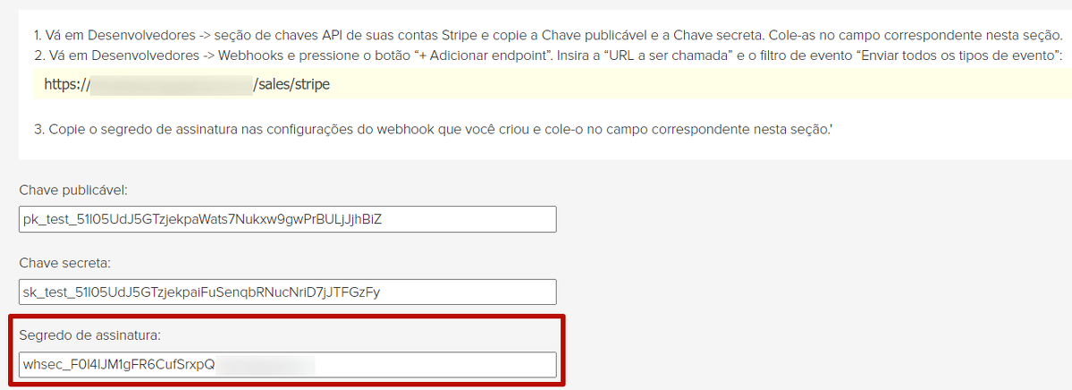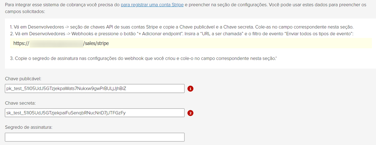 Insira o valor dos campos Publishable key e Secret key nos campos correspondentes da conta GetCourse.
