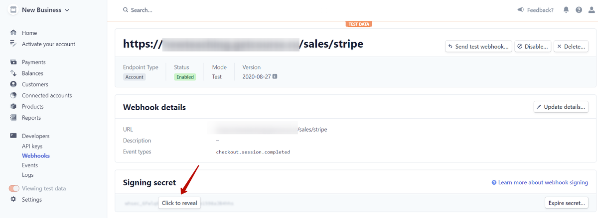 Em seguida, clique na linha adicionada e adicione o Signing secret, valor que é necessário inserir nas configurações do sistema de pagamento na GetCourse.