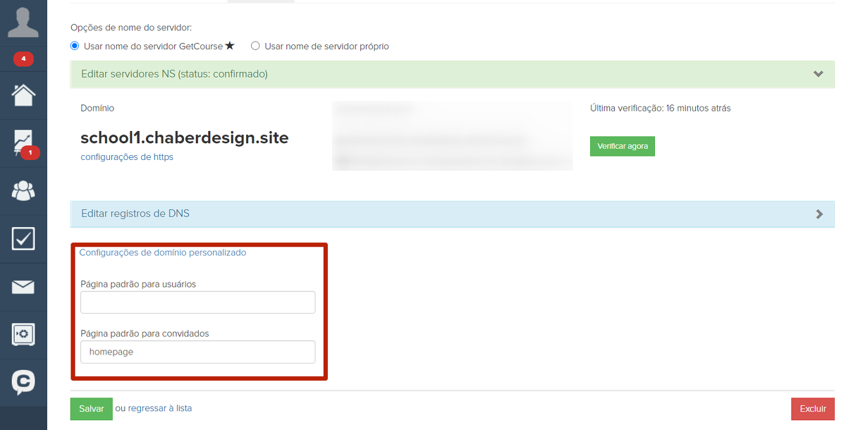 Nas configurações de cada domínio, há a opção de configurações especiais que permite que cada domínio ou subdomínio conectado à GetCourse defina suas próprias páginas iniciais para convidados e usuários autenticados.