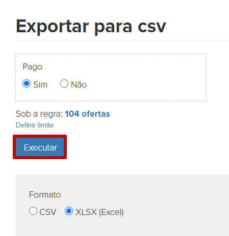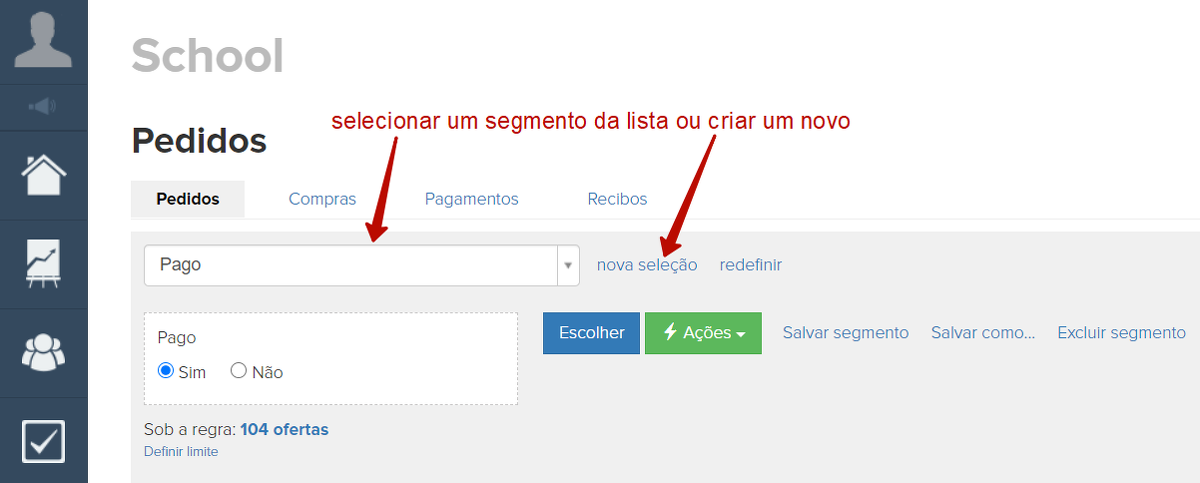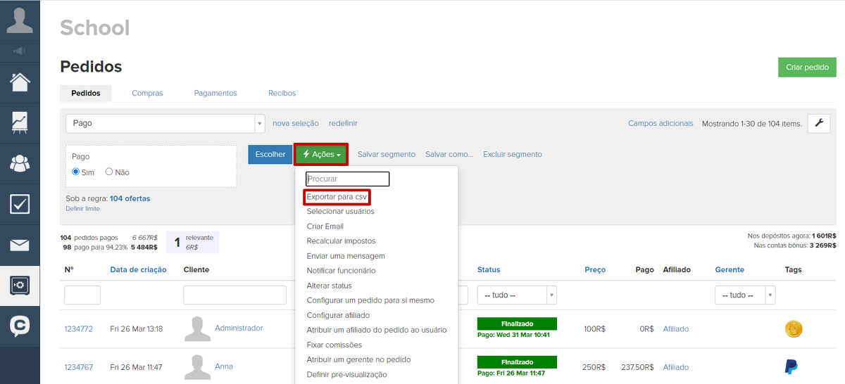 Para exportar os pedidos do sistema, é necessário entrar no item do menu "Pedidos", selecionar um segmento pronto de pedidos ou criar um novo por conjunto de condições, e depois, através do botão "Ações" realizar a exportação.