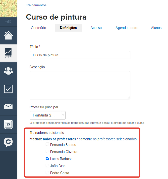 Para trabalhar no curso, além do professor principal, é possível colocar professores auxiliares.