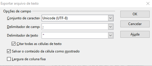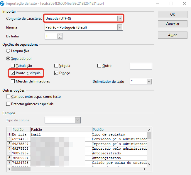 Em seguida, selecione a codificação do arquivo - UTF8 e o separador - ponto e vírgula.