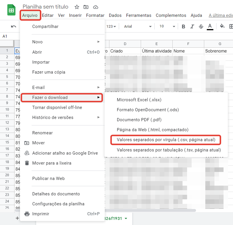Para baixar um arquivo do Google Docs no formato .CSV, clique em "Arquivo'' - ''Fazer o download'' - ''Valores separados por vírgula (página atual)".