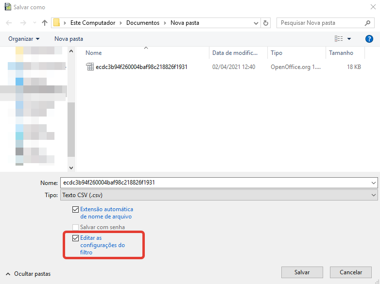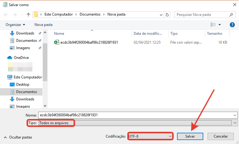Verificamos a codificação (ela deve ser UTF-8) e alteramos o tipo de arquivo para "Todos os arquivos".