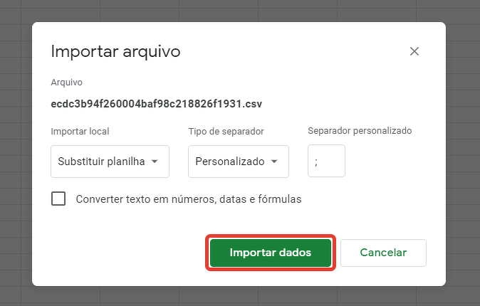- Na caixa Converter texto em números, datas e fórmulas, não selecione.