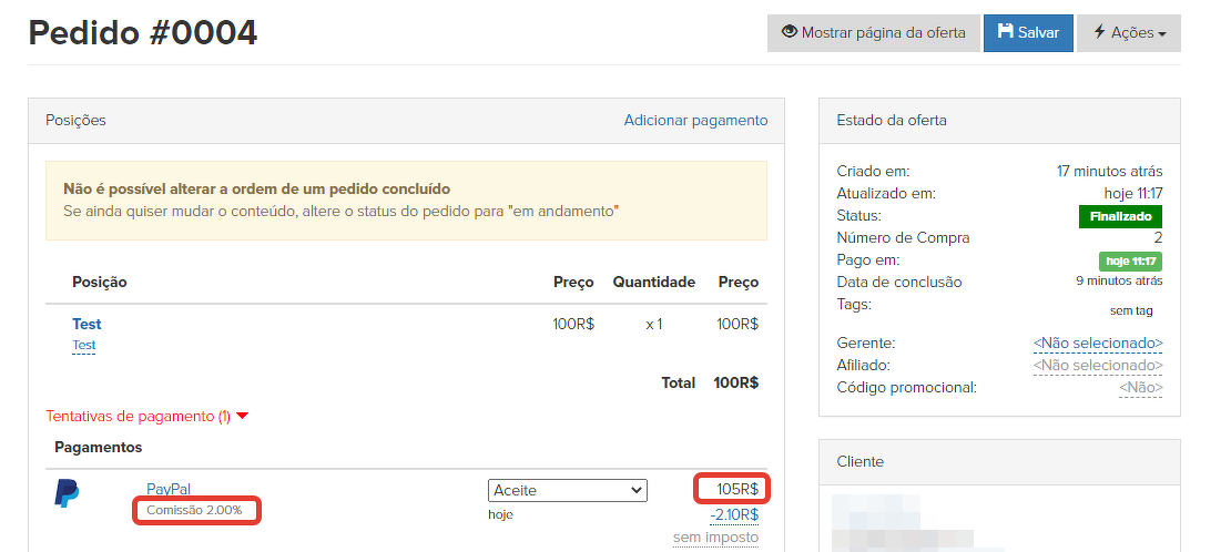 O pedido indica o imposto e a comissão definidos pelo sistema de pagamento.