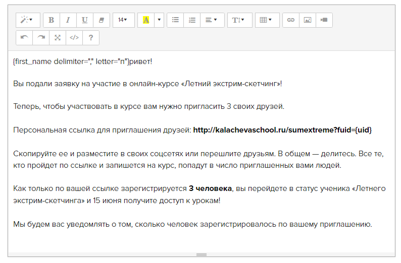 Graças ao script, cada usuário teve um link único para a landing do curso. Ele pôde ser publicado nas redes sociais ou compartilhado em mensagens privados, reenviado por e-mail. Quando os usuários convidados acessavam o link no e-mail, a plataforma registrava o registro viral e atribuía o novo usuário ao seu "pai" a partir do banco de dados.