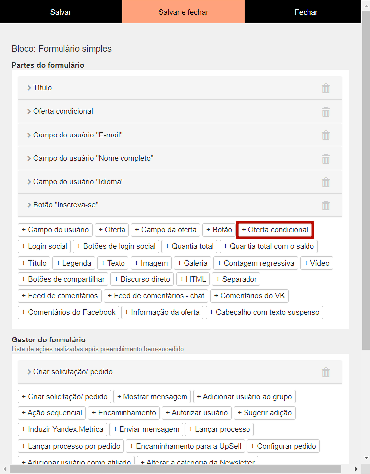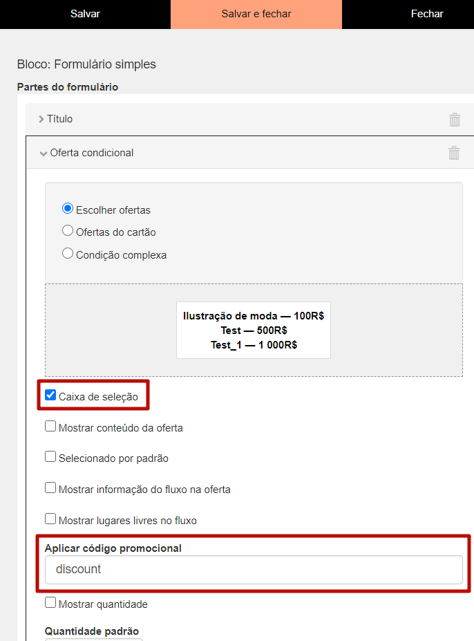 No formulário, utilizamos o bloco "Oferta por condição", obrigatoriamente selecionamos a opção "Caixa de seleção" e inserimos o código promocional.