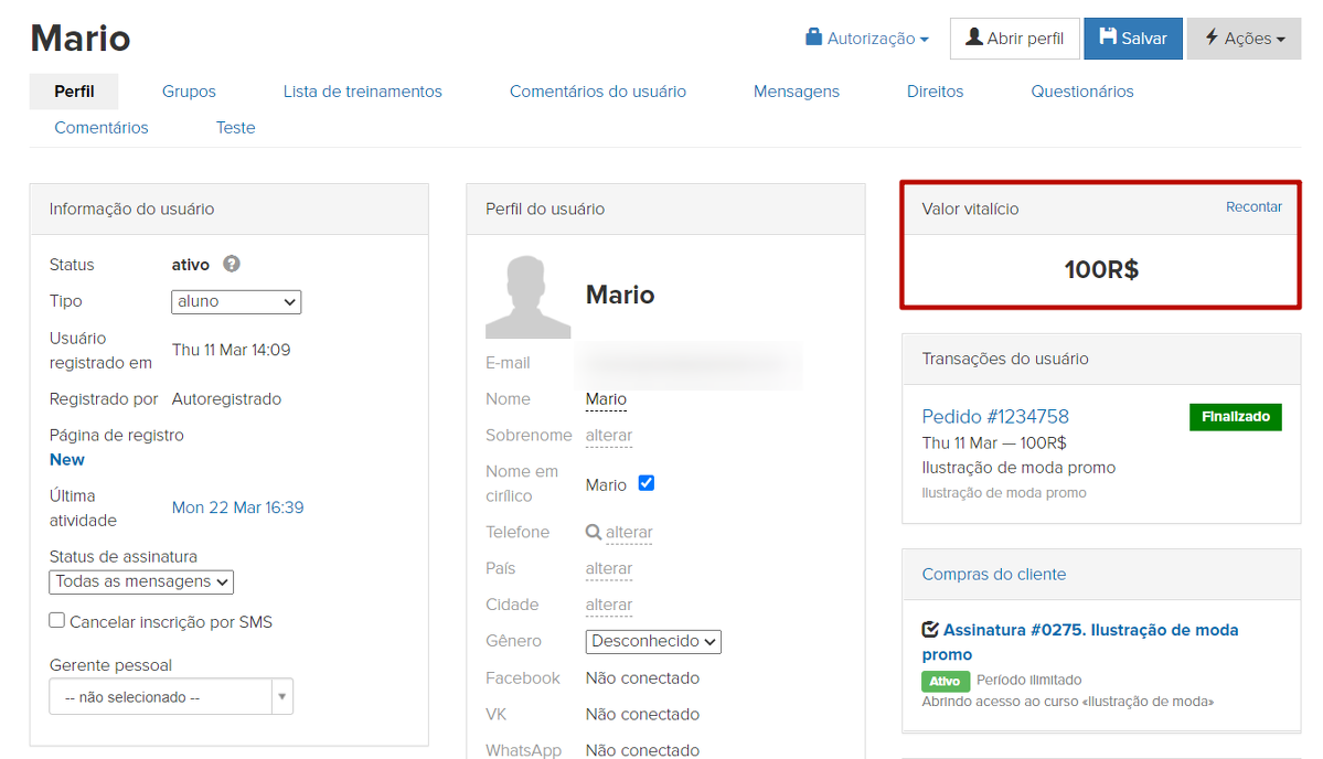 Além disso, pode-se indicar nas configurações por quanto tempo o sistema calculará a quantia de dinheiro recebido do cliente: desde o momento do seu cadastro ou, por exemplo, no último mês.