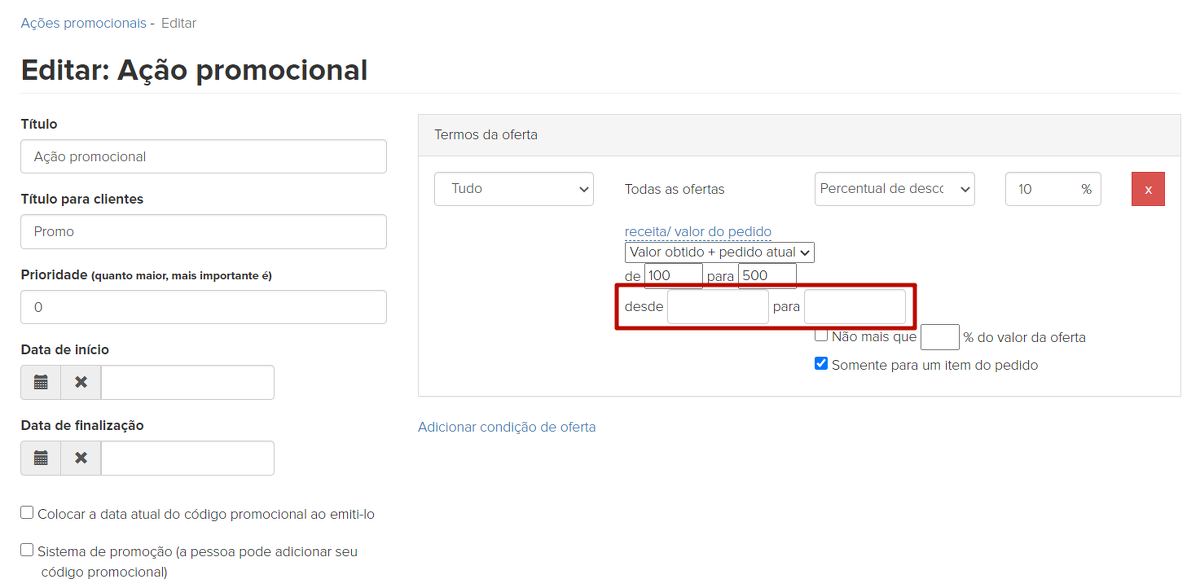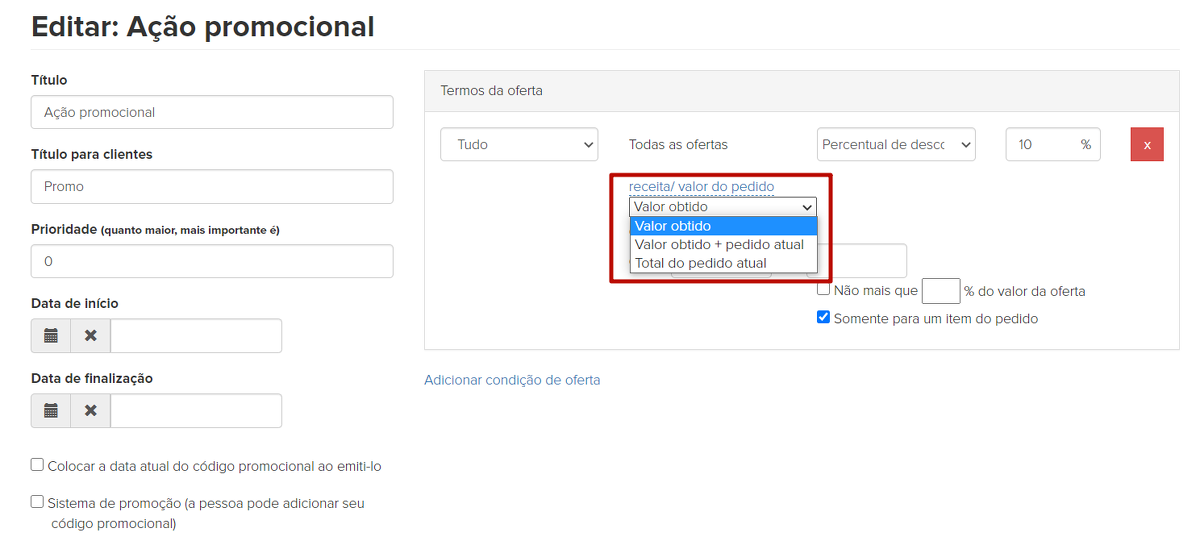 Total do pedido atual - ao selecionar este item nas configurações da promoção, o sistema fornece um desconto dependendo apenas do total do pedido atual do usuário.