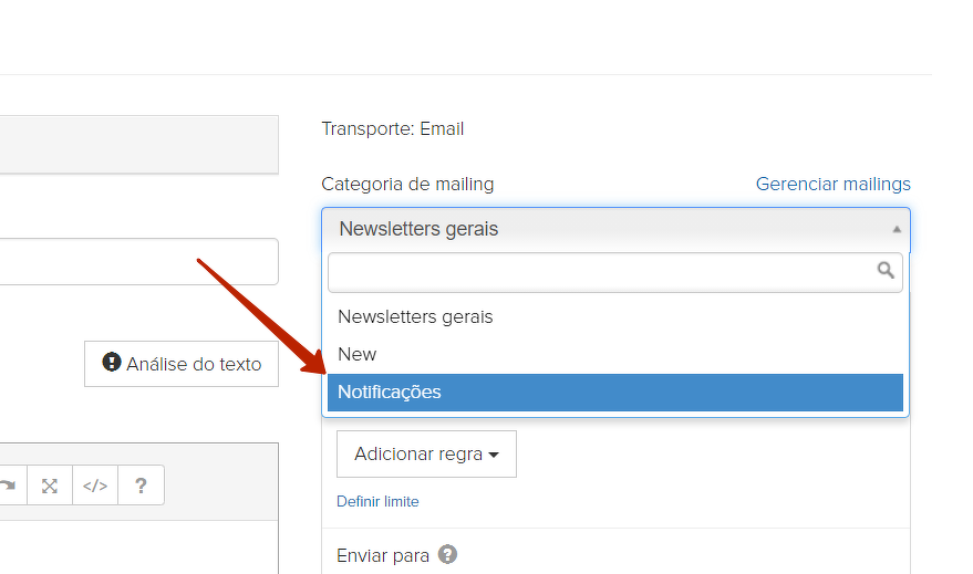 Nas categorias das listas de e-mail existe uma categoria específica - "Notificações".