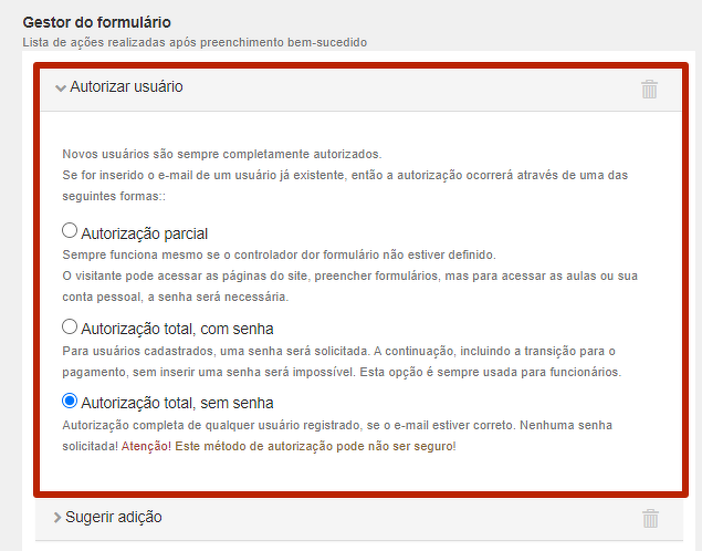 No controlador do formulário, a autenticação do usuário é obrigatória, conforme a opção "Autenticar os usuários existentes sem inserir a senha".