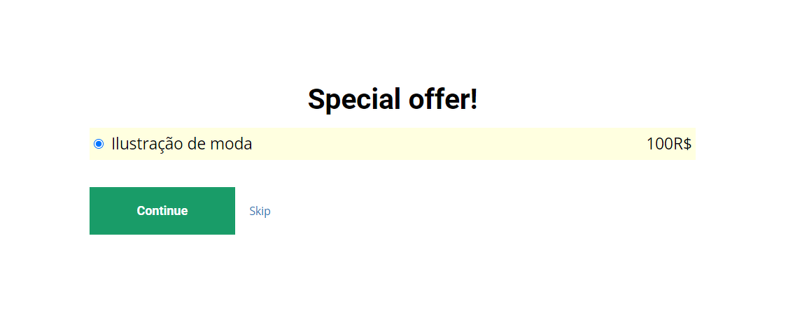 Após o preenchimento do formulário, serão apresentadas informações sobre a oferta adicional, caso haja consentimento, o adicional será adicionado ao pedido, caso o usuário clique em "Pular" - vá para a página de pagamento do pedido da oferta principal.