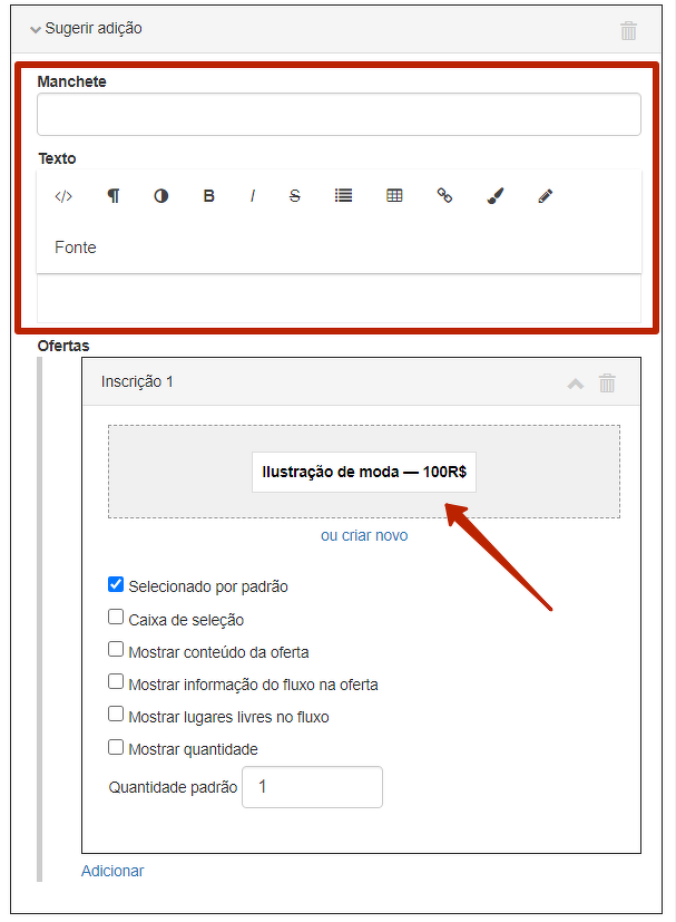 Nas configurações do bloco do formulário com a oferta, adicione a opção "Sugerir adição", insira nos campos "Título" e "Texto" as informações sobre a oferta, selecione a oferta da lista ou crie uma nova.