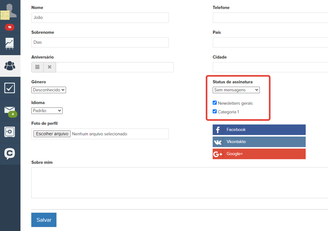 O usuário também pode alterar o status de inscrição em seu próprio perfil.