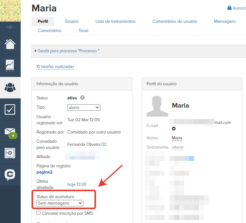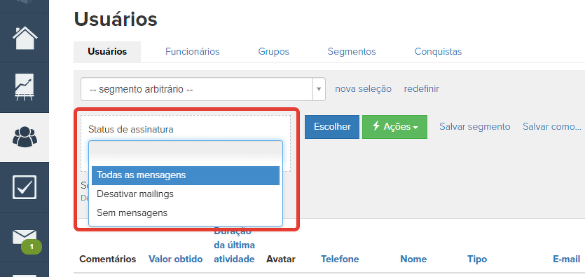 É possível acompanhar os status de inscrição dos usuários por meio da condição "Status de assinatura".