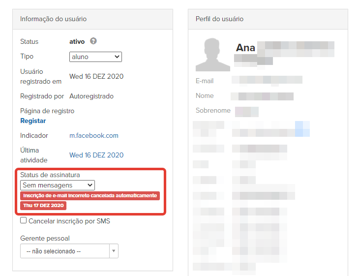 O administrador da conta pode alterar o status de inscrição do usuário manualmente no cartão do usuário.