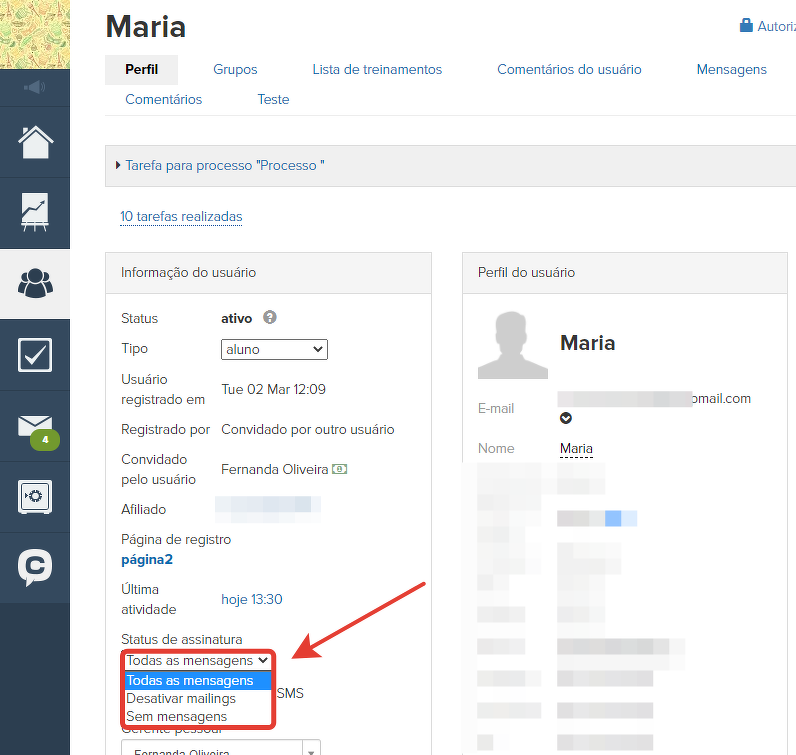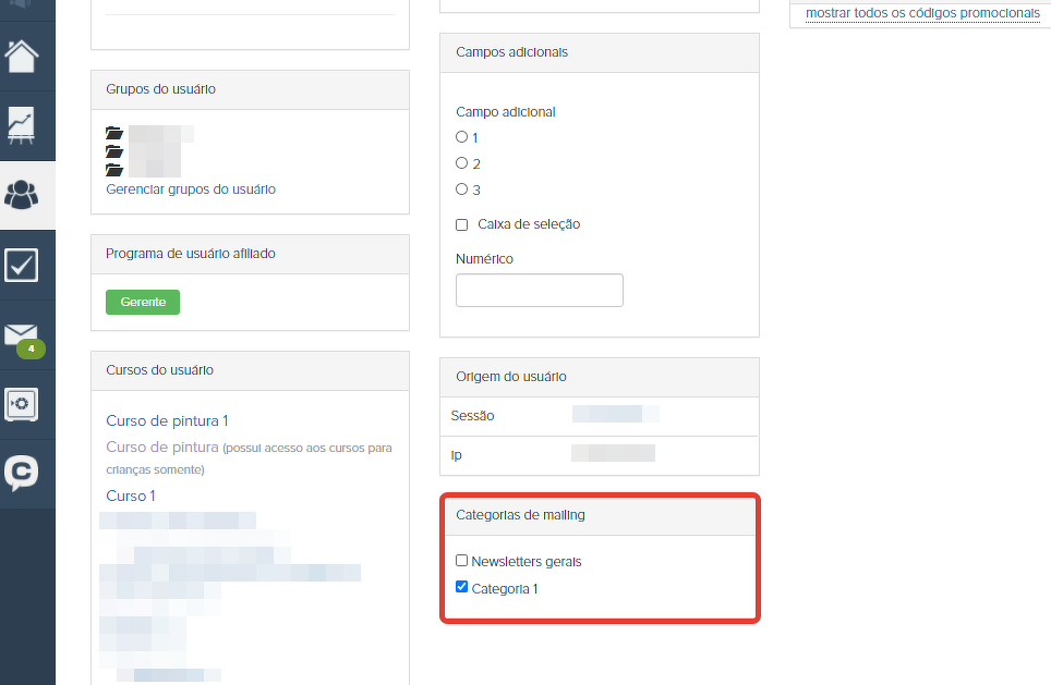 No cartão do usuário, o administrador também pode cancelar ou inscrever novamente o usuário para receber as listas de e-mail de uma determinada categoria.