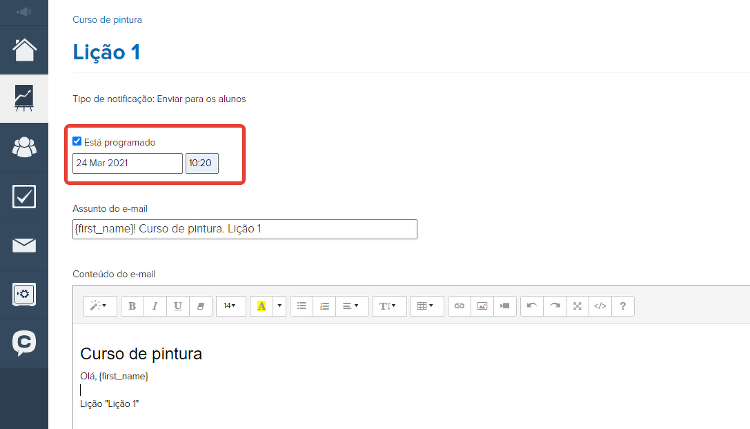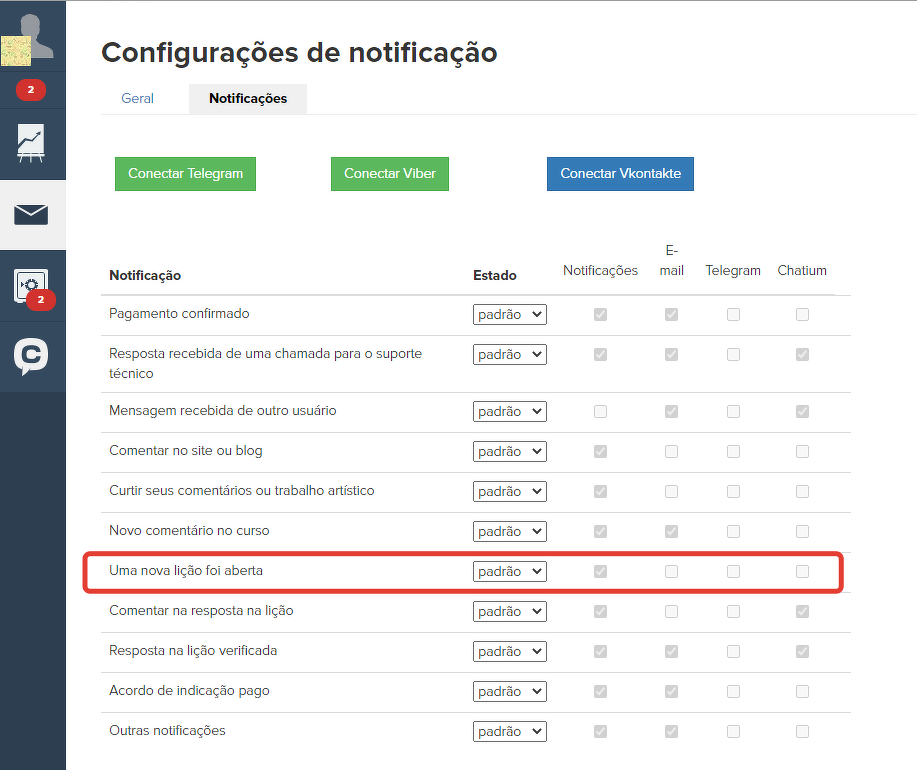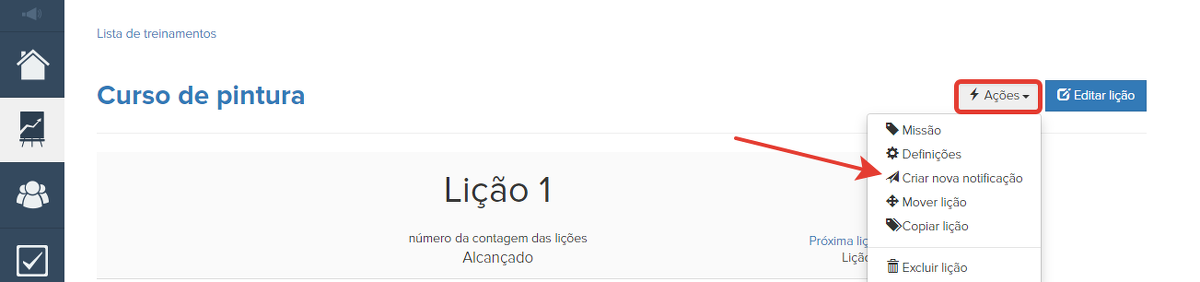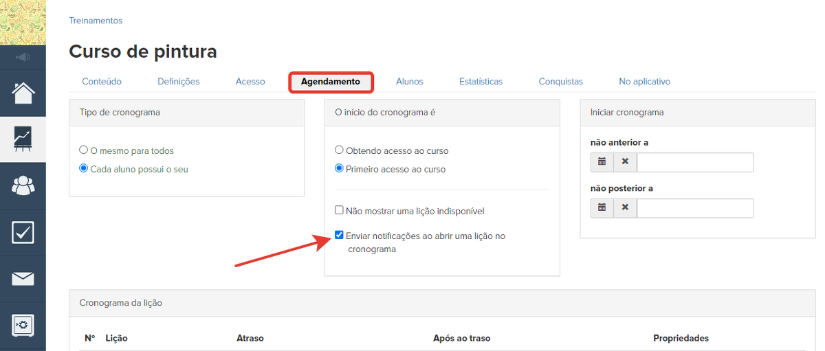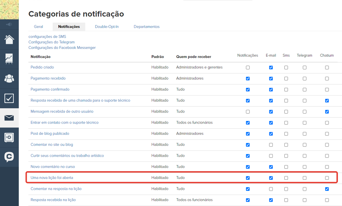 Importante: as notificações de lições de qualquer tipo serão enviadas apenas para os participantes do curso, que são os usuários que têm acesso a ele, o status “Ativo” e são exibidos no curso na guia “Alunos”.
