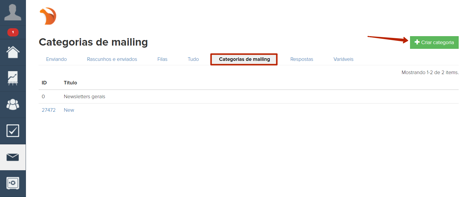 As listas de e-mail que você envia aos usuários podem ser dividas em categorias. Para criar uma nova categoria, vá em "Mensagens" - "Listas de e-mail" - "Categorias de listas de e-mail" e aperte "Criar categoria".