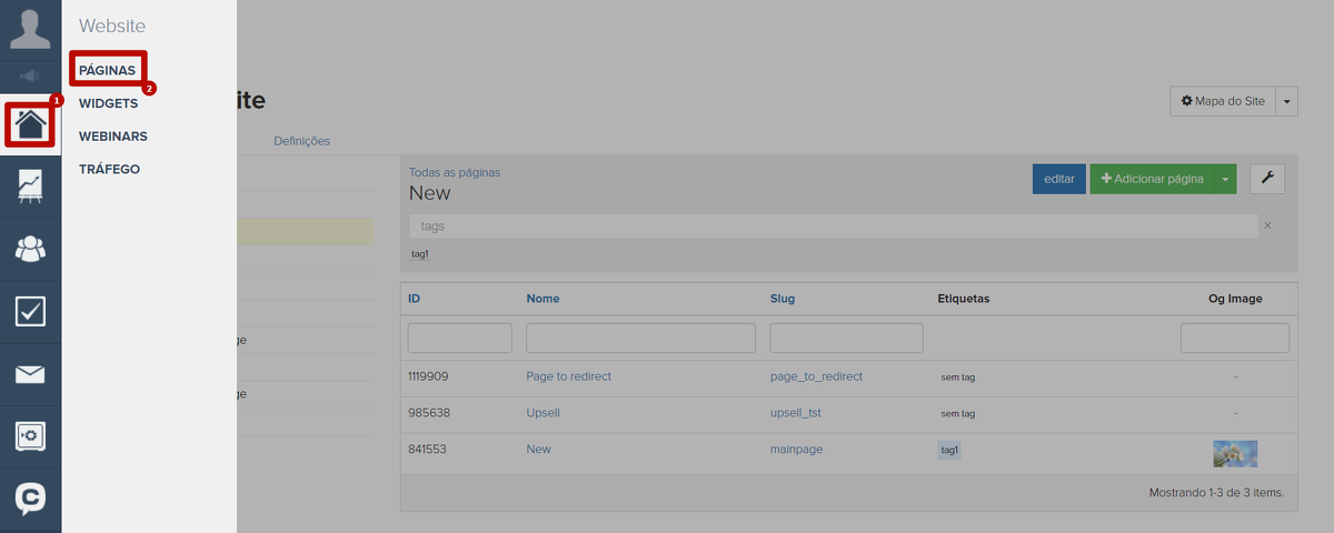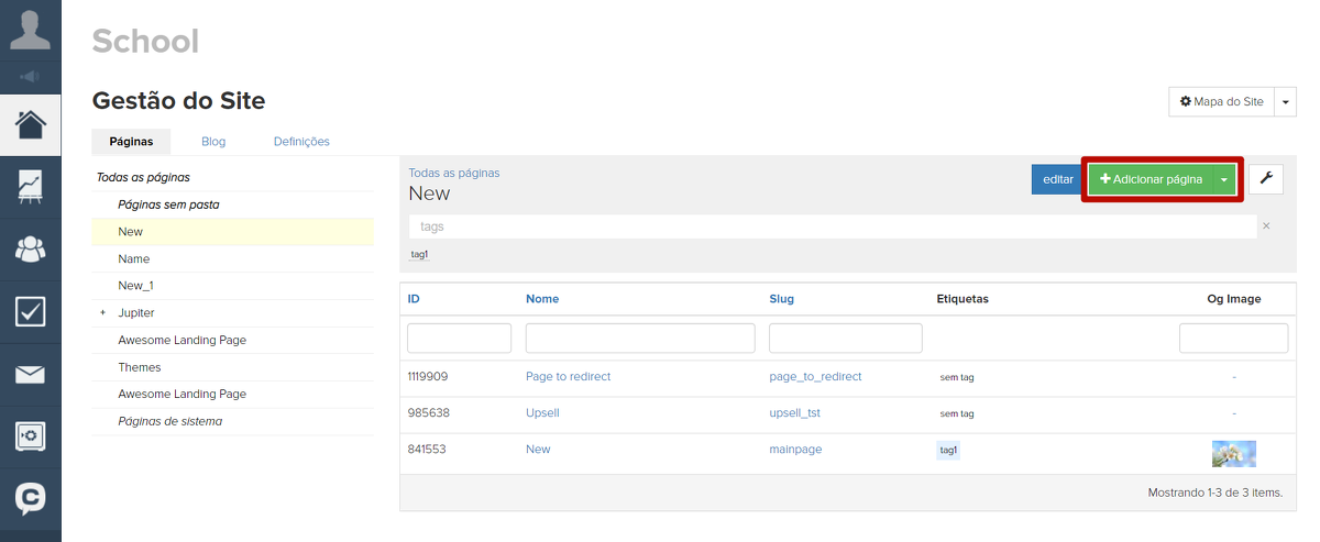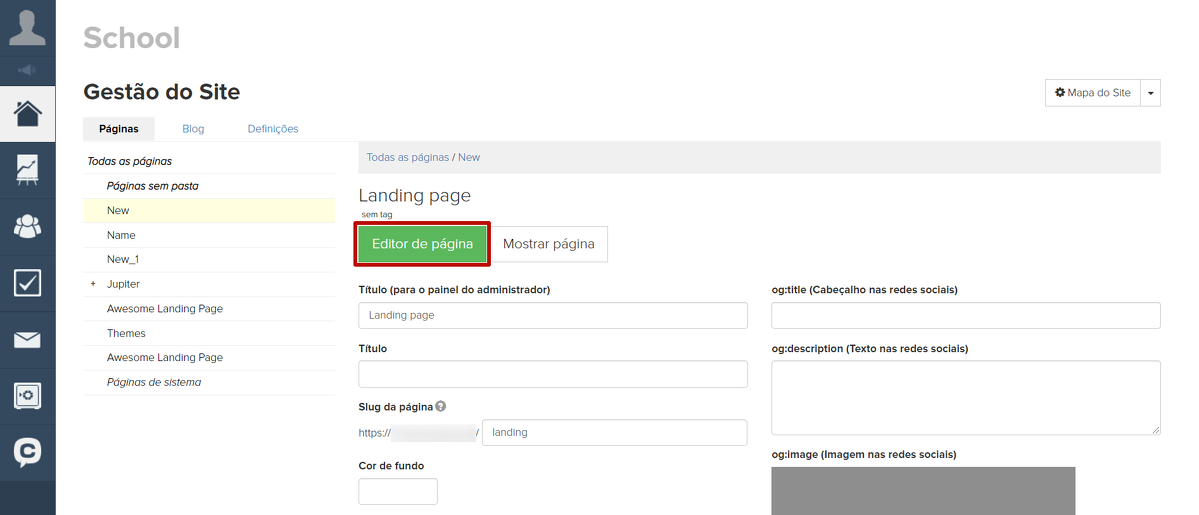 Para editar uma página criada e adicionar nela os blocos necessários, utilize o botão "Editor de página":