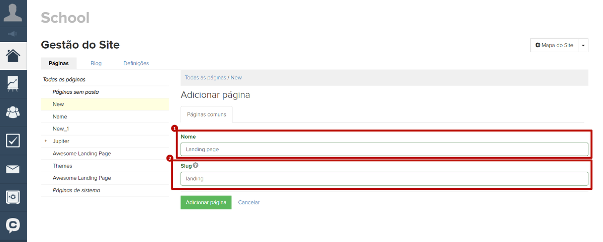 Observe que:- o nome da página é o de serviço e não será exibido aos usuários;