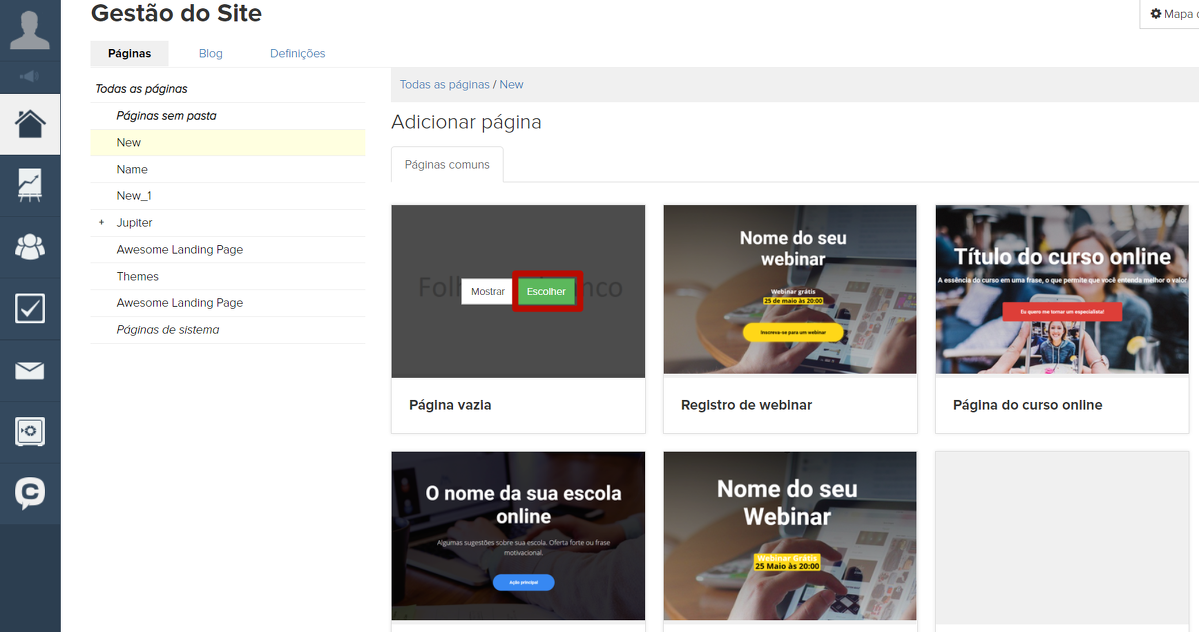 Para a criação de uma página (landing), vá na seção "Página", aperte o botão "Adicionar página" e selecione "Modelo Vazio":