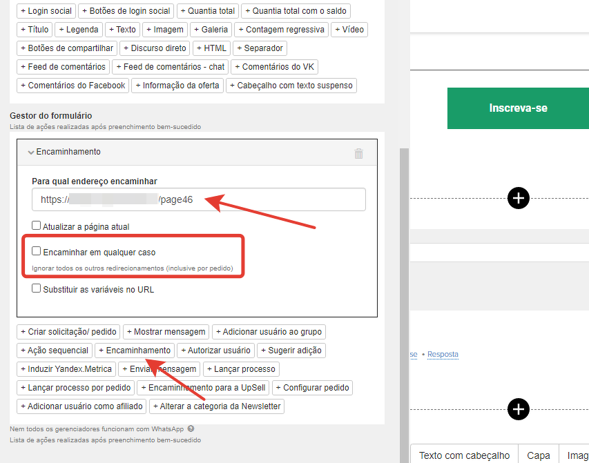 A função "Redirecionar em qualquer caso" é válida para o redirecionamento incondicional, por exemplo, no caso de realização de um pedido, o usuário será transportado para a página indicada, e não para a página do pagamento.