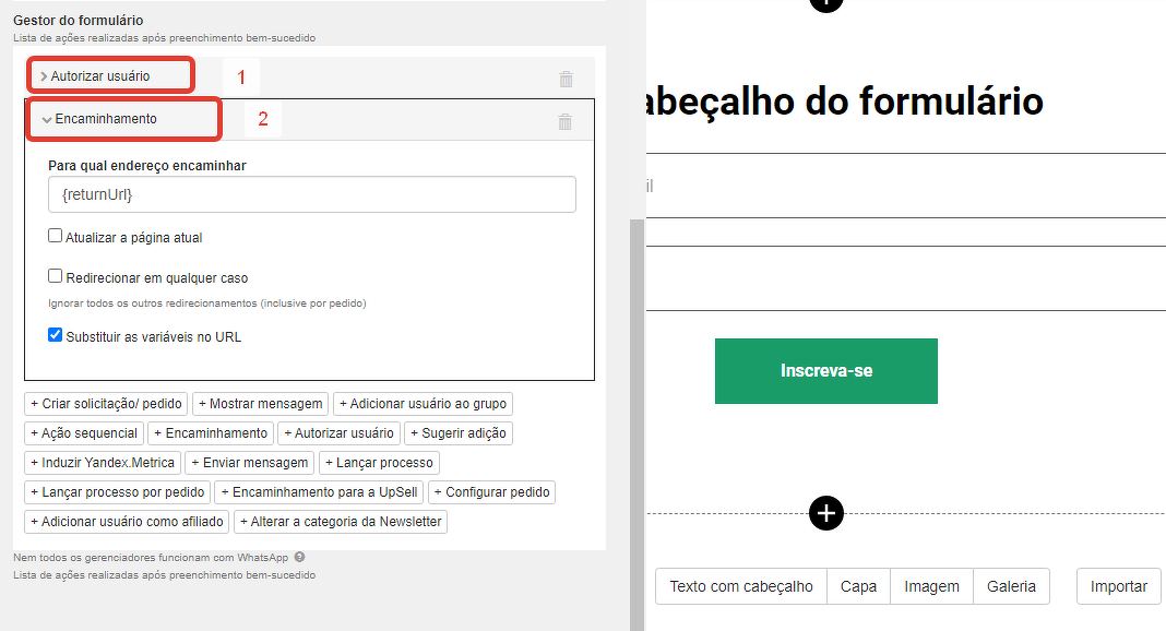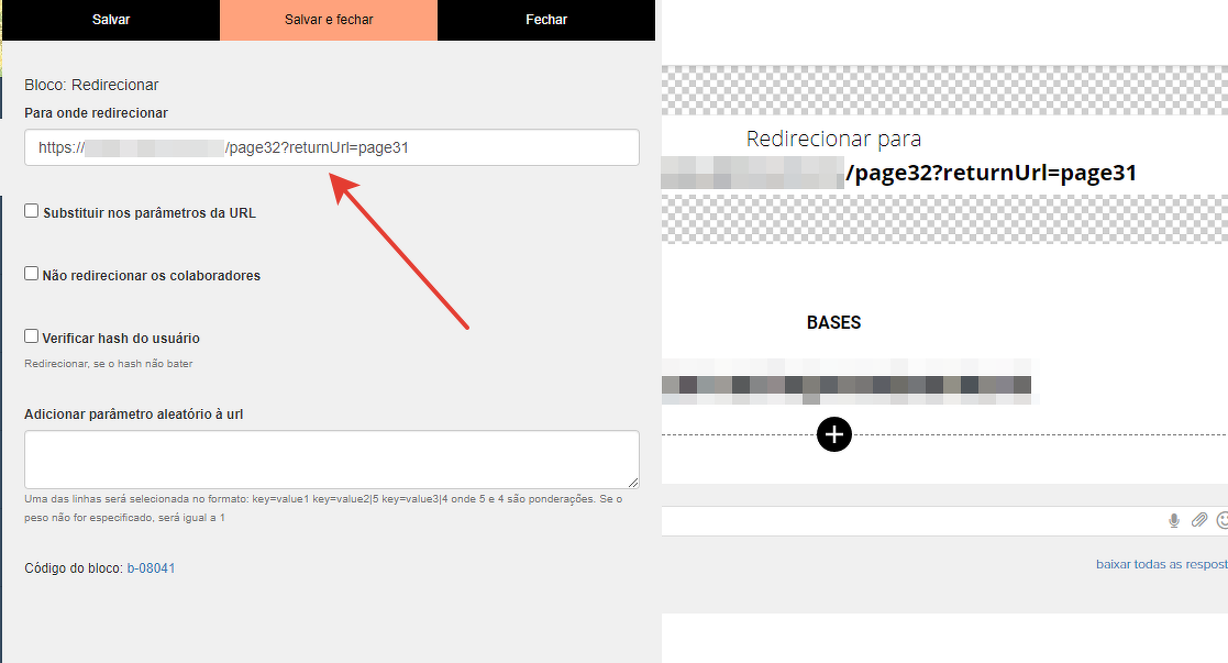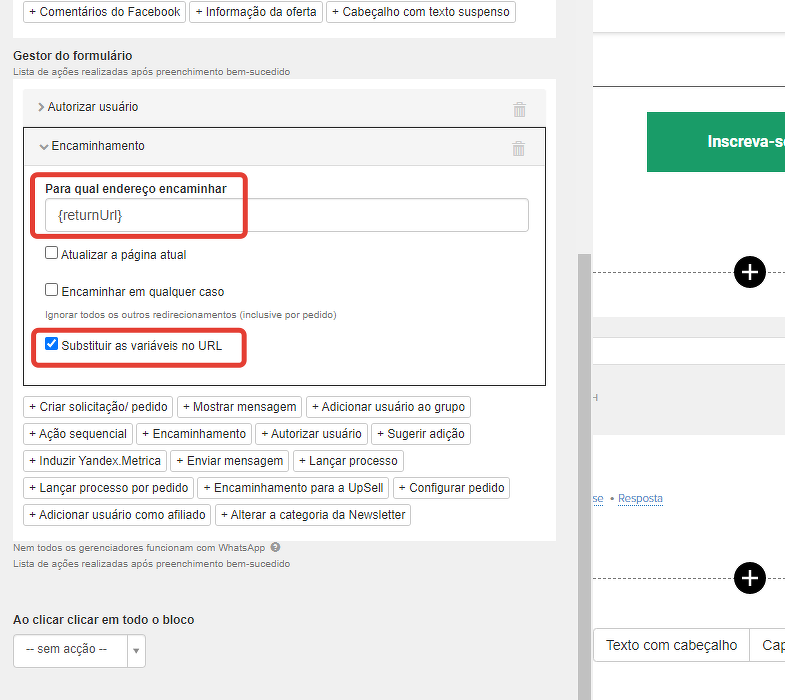 Se você especificar a variável returnUrl como o endereço de redirecionamento e marcar a opção "Substituir variáveis na URL", a variável {returnUrl} será substituída pelo valor do parâmetro returnUrl durante o redirecionamento.