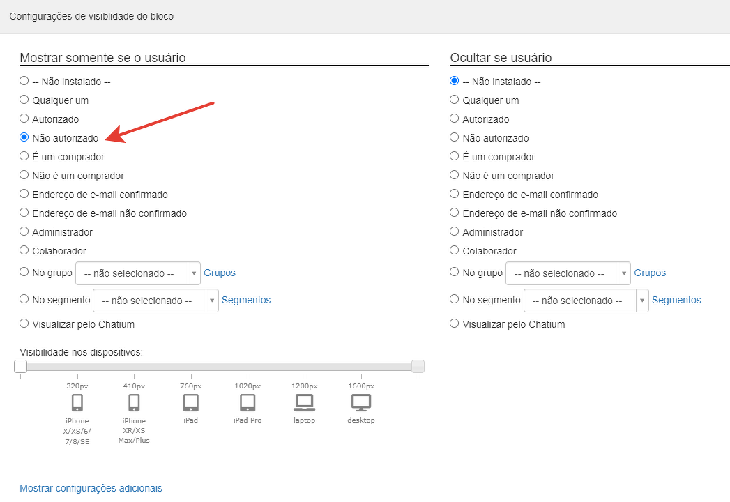 Só é possível configurar a exibição de um bloco com um redirecionamento para os não-autenticados usando a visibilidade do bloco.