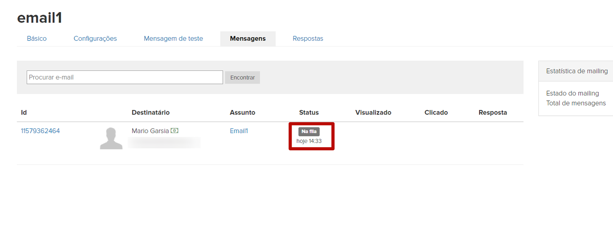 Indo para a lista de mensagens enviadas por lista de e-mails, pode-se sempre visualizar o tempo aproximado em que a mensagem será enviada ao destinatário: