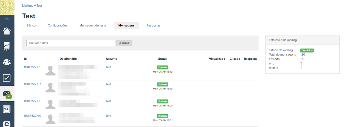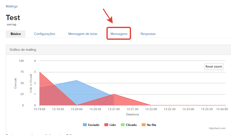 Para visualizar todas as mensagens enviadas da lista de e-mails, é necessário acessar a lista de e-mails desejada.