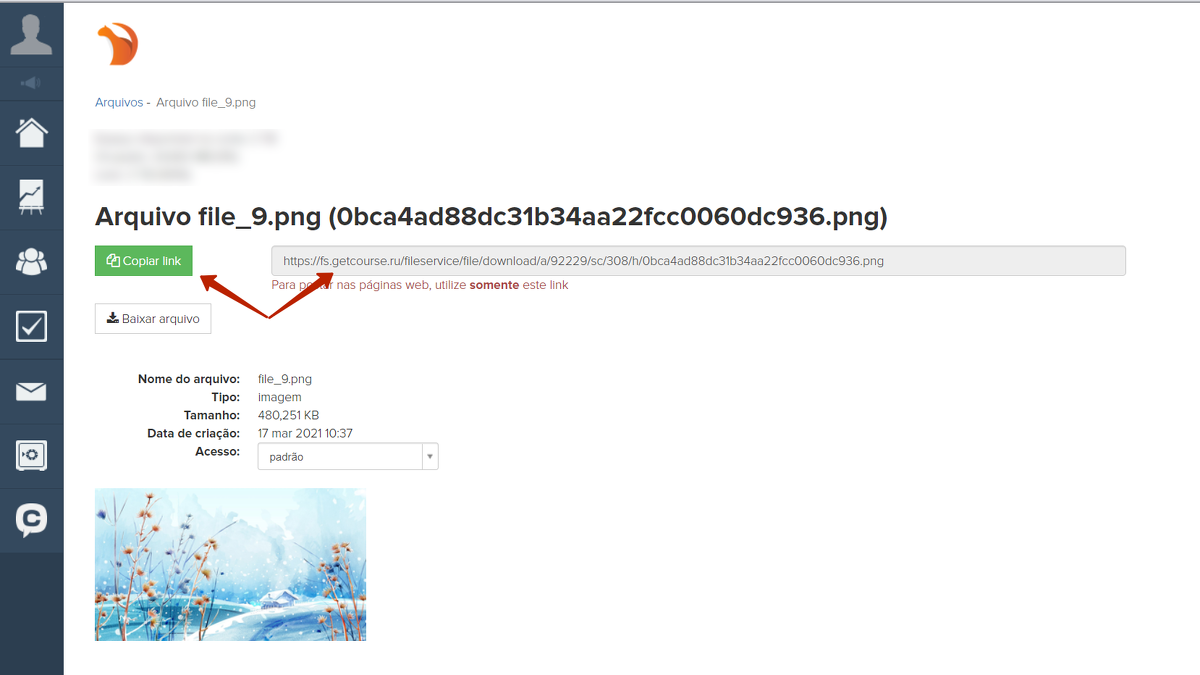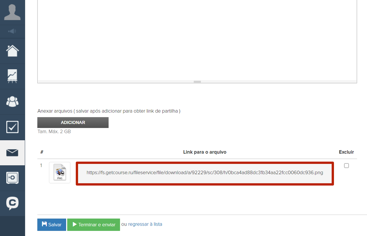 Sendo assim, vamos mostrar como carregar um arquivo no armazenamento de arquivos da GetCourse e adicionar um link à mensagem: