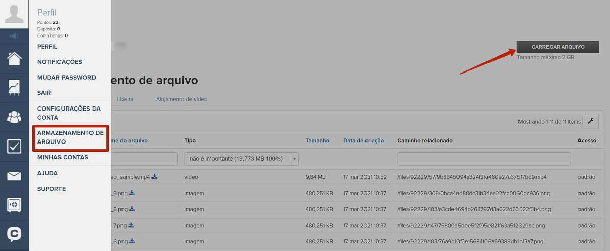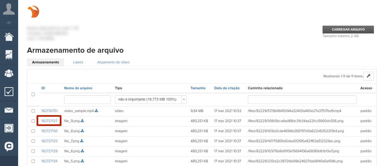 1. Carregue o arquivo no armazenamento de arquivos da sua conta: