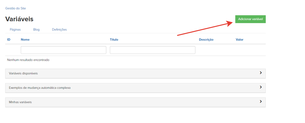 Para criar uma variável, é preciso ir na seção "Site" - "Páginas" - "Variáveis":