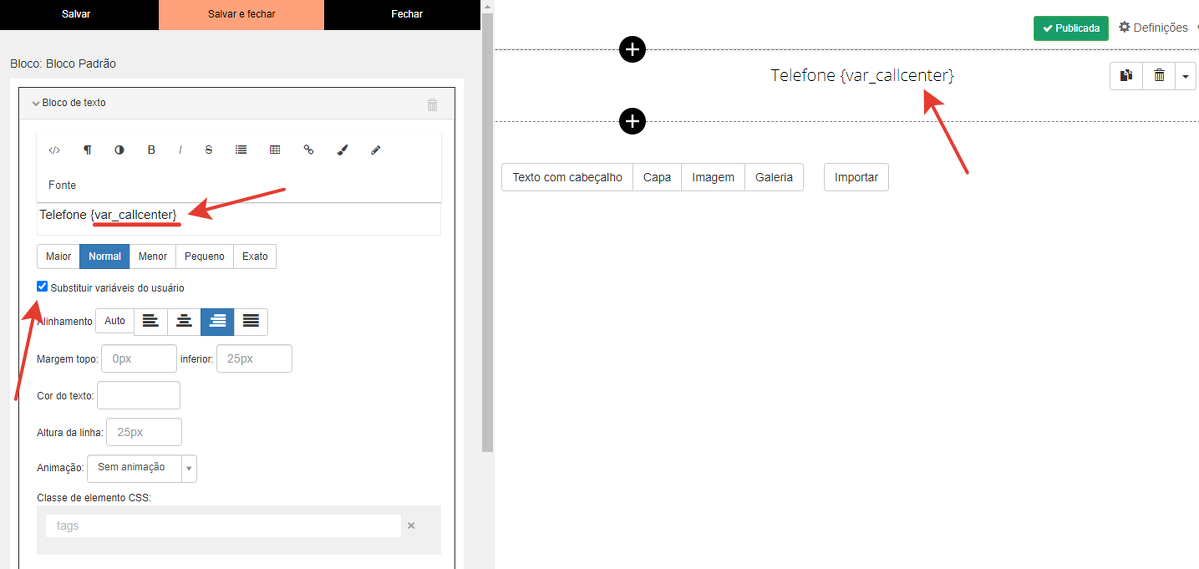 Por exemplo, no modo de edição, adicionamos na página o nome da variável (começando com {var_}) e marcamos a opção "Substituir as variáveis do usuário" nas configurações do bloco: