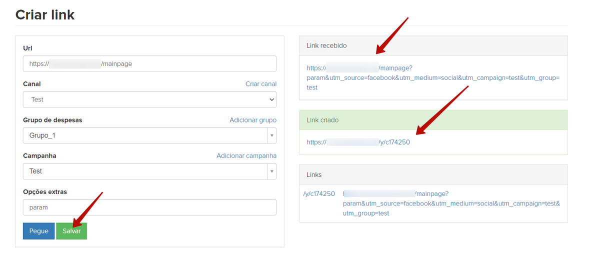 Pelo botão "Salvar", você pode ver o link completo e o link curto: