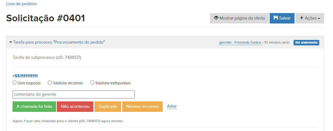 Se o usuário forneceu um número na solicitação ou conforme solicitado pelo gerente, o sistema iniciará a tarefa de ligação. Esta tarefa está incorporada ao processo de processamento de pedidos em forma do subprocesso "Vamos ligar por três dias".