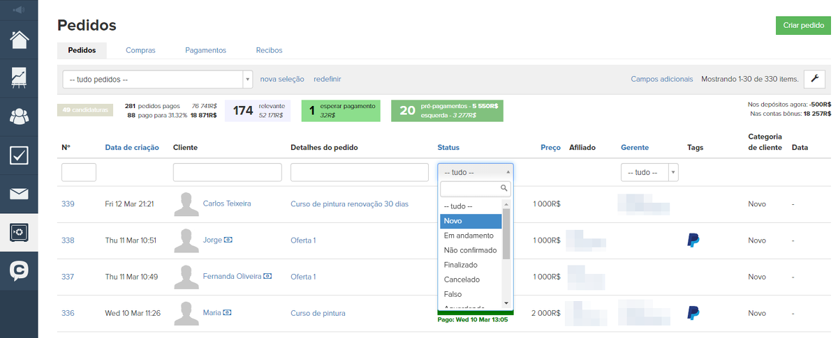 Pedidos não pagos aparecem na seção "Pedidos" com o status "Novo". Em "Pedidos", é possível ordenar a lista de solicitações por status e por colaboradores que trabalham com os pedidos.