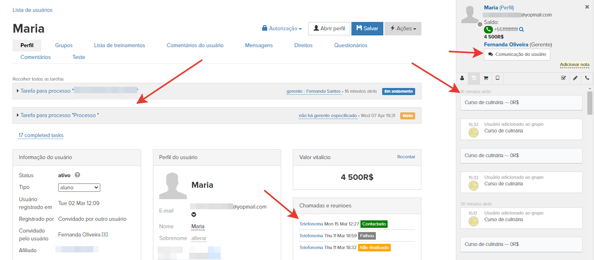 O processo interno da plataforma GetCourse está estreitamente ligado ao CRM. Ou seja, você terá toda a comunicação com o cliente disponível - solicitações, registro de ligações, todos os pedidos.
