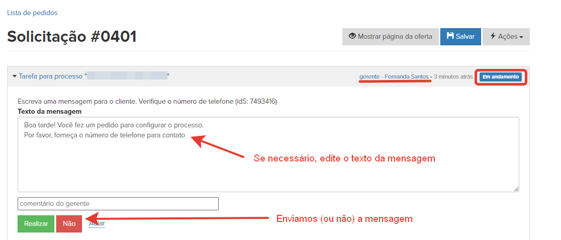 A verificação de que o usuário forneceu ou não o telefone é realizada automaticamente. Se não há um número na solicitação, então o gerente passará o pedido para o status "Não confirmado" e enviará uma notificação pedindo para fornecer o número de telefone. Após esperar por cinco dias uma resposta do usuário, o sistema mandará um lembrete ao gerente para verificar a solicitação.
