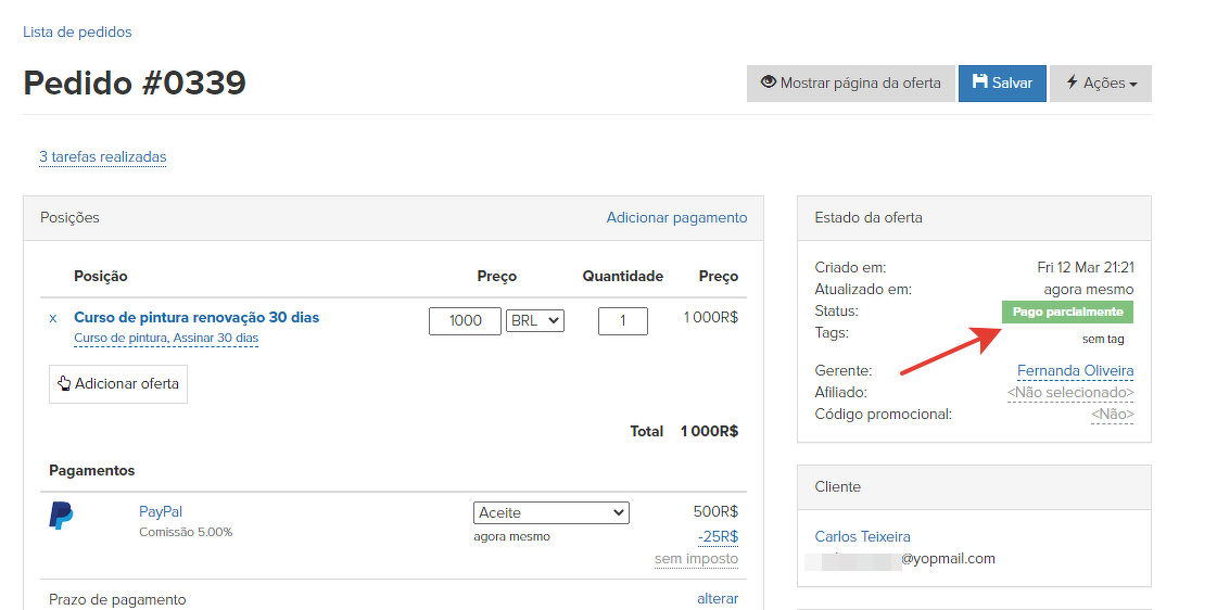 O próximo passo será verificar o pagamento do pedido. Por exemplo, o usuário poderia pagar parte do valor, se você oferecesse essa possibilidade. O gerente coloca os pedidos não pagos no status "Em andamento".