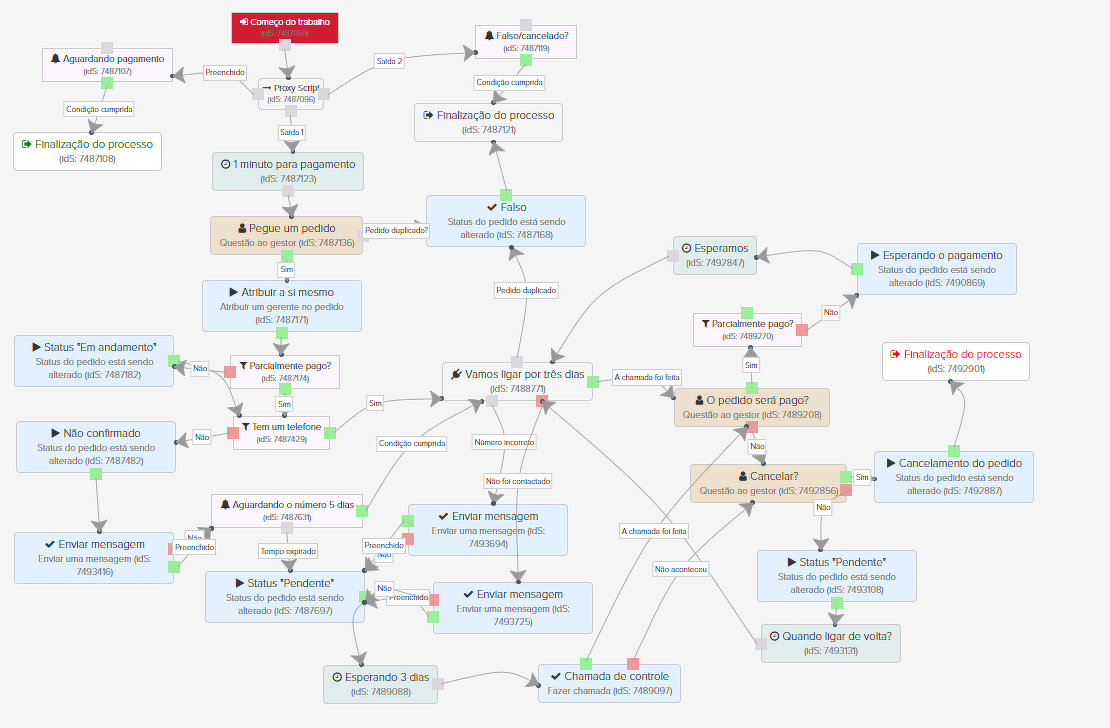 O ponto de partida do processo - cai no sistema a solicitação do usuário de um determinado produto. Há duas saídas no processo - quando recebemos o pagamento ou o algoritmo entende que o pedido foi falso (cancelado). Se durante alguns minutos o usuário pagar o pedido, então o processo é finalizado automaticamente. O processo também é finalizado em qualquer etapa assim que o pagamento é efetuado.