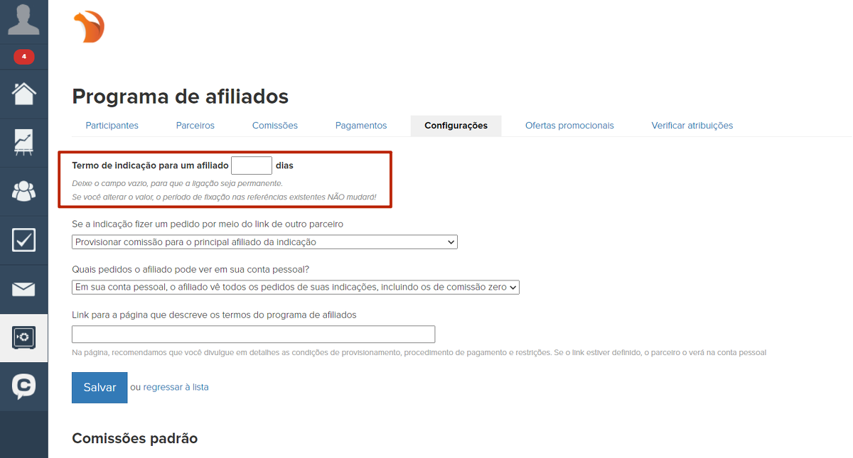 Também pode-se indicar nas configurações do programa de afiliado por quanto tempo um usuário indicado fica atrelado a um afiliado.