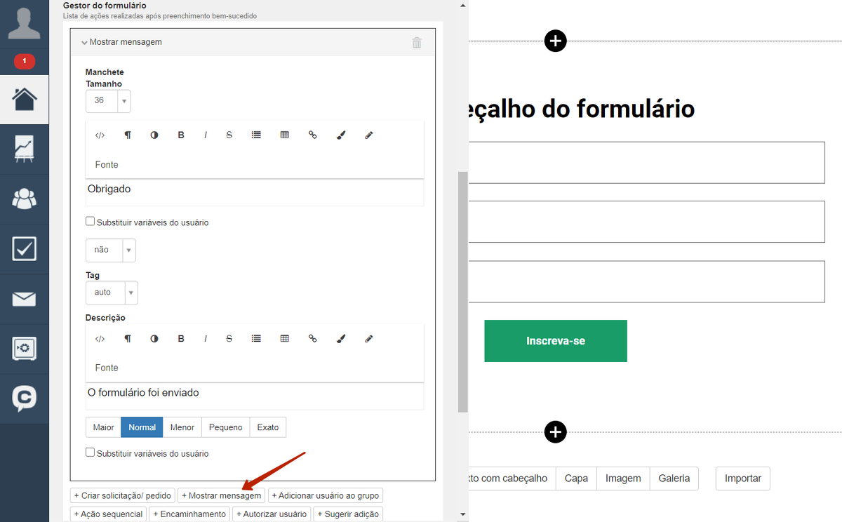 Se você quiser, após o preenchimento e envio do formulário, pode aparecer uma mensagem para o usuário, adicione a ação "Mostrar mensagem" no controlador do formulário. Você poderá configurar o texto e a aparência da mensagem exibida.