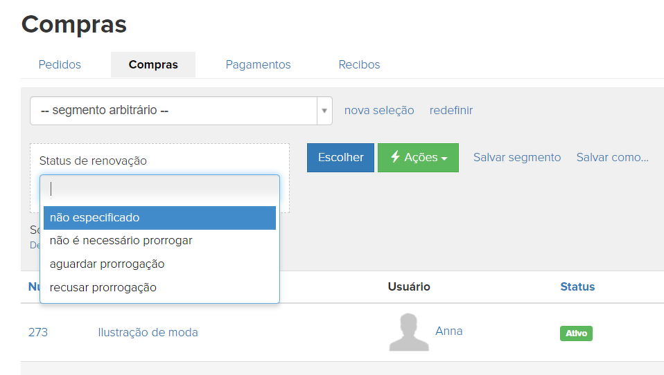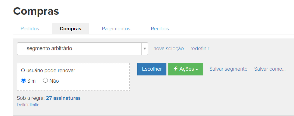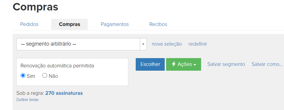 Você pode configurar a renovação de compra. Se você deseja selecionar essas compras, use as seguintes opções: