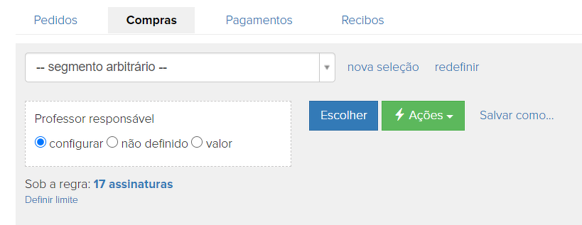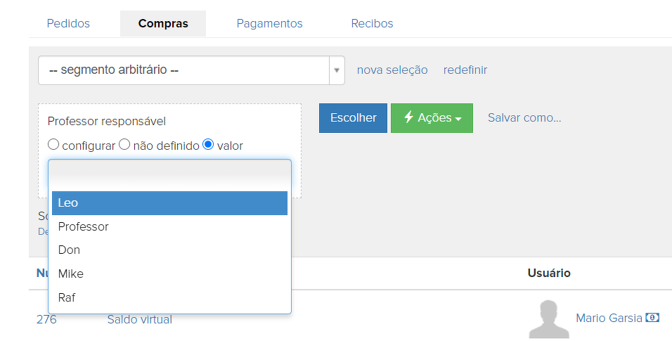 Nas configurações de curso na oferta, assim como em uma compra específica, você pode indicar o professor responsável (curador pessoal). Para selecionar compras vinculadas ao professor, você precisa usar a seguinte condição: