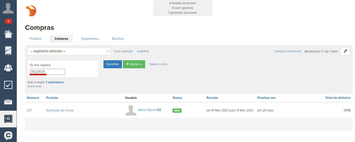 - "ID dos objetos" - identificador único de compra na conta (é exibido no link para a compra). Você pode utilizá-lo, caso queira selecionar uma ou várias compras específicas.