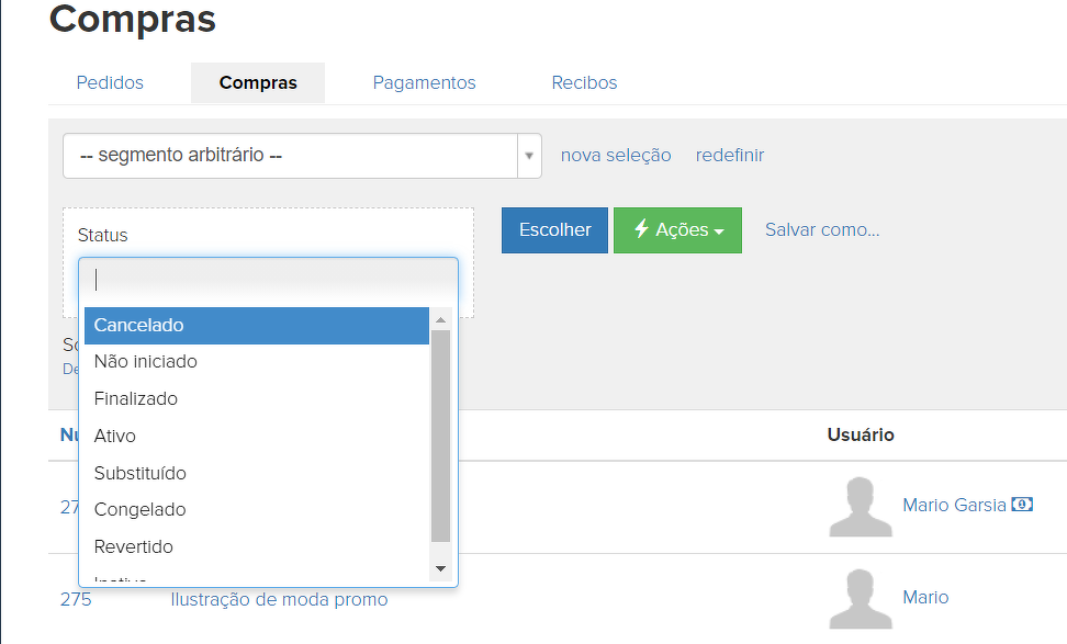 - "Válida" - por meio desse parâmetro, pode-se selecionar compras em andamento ou finalizadas/canceladas: