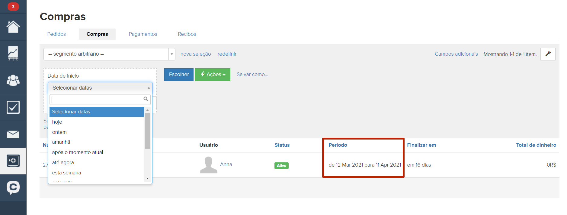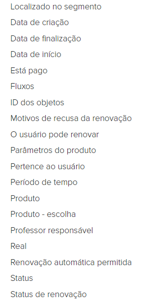 Data de início - é data quando a compra se tornou ativa. A data de término é a data em que a compra se tornará inativa (esta data será indicada se a oferta for definida como limite de tempo ou assinatura). Data de criação - é data quando a compra foi criada. Ao trabalhar com essas condições, você pode selecionar datas específicas e um período.